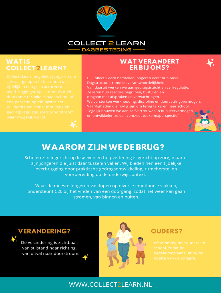 Wanneer school (even) niet lukt, betekent dat niet dat een jongere stil moet staan. Bij Collect2Learn krijgt je kind ruimte om te ademen, te bewegen, te ontdekken en opnieuw richting te vinden.